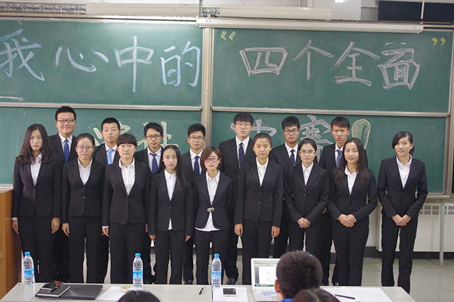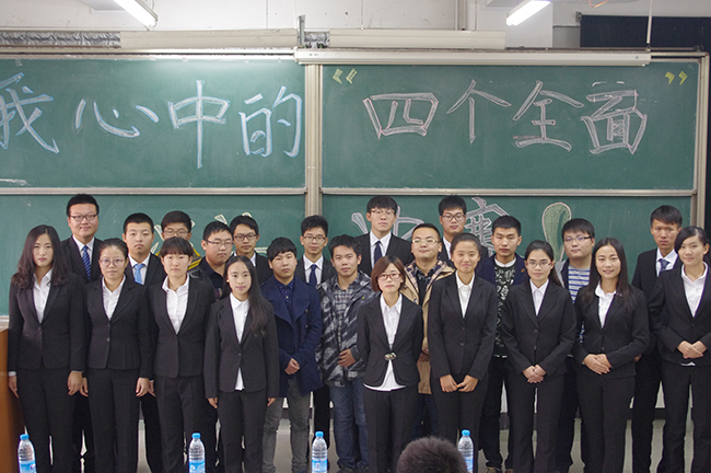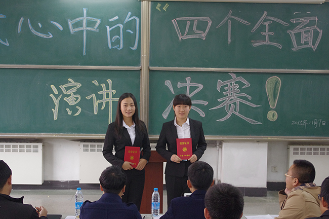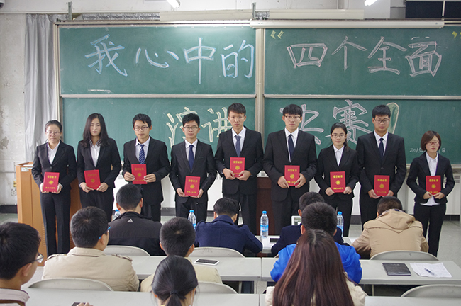 2014年12月,习近平总书记在江苏调研时首次提出“四个全面”这一战略布局,意蕴深邃。这四个全面分别指:全面建成小康社会、全面深化改革、全面推进依法治国、全面从严治党。为让我校学生深入理解“四个全面”这项方针,使其更贴近我们的生活,思政委于11月7日上午举办了“我心中的四个全面”演讲比赛决赛。