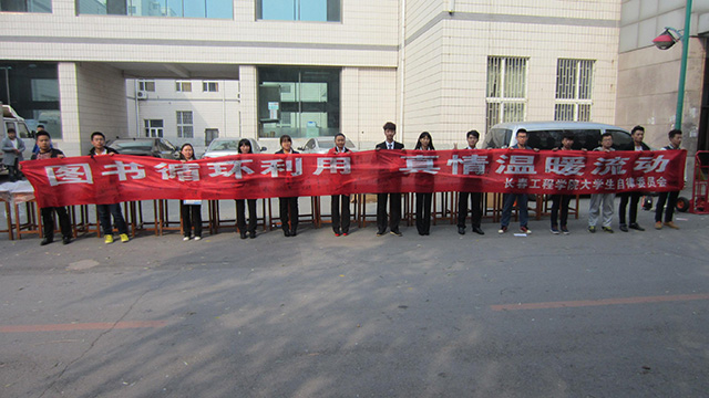 为响应“建设节约型社会”的号召,倡导同学们循环使用图书,增强同学的循环使用意识,近期长春工程学院大学生自律委员会在校本部一食堂楼前、西区五教楼前和湖东校区同时举行了“图书循环,爱心传递”签名和图书捐赠系列活动。